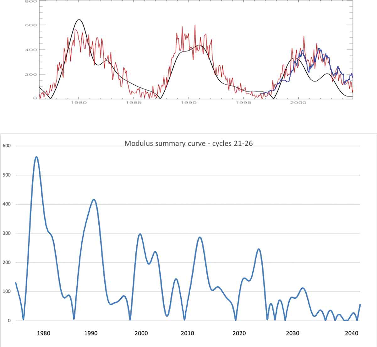 Die Summenkurve zweier magnetischer Wellen erklärt viele Merkmale der 11-Jahres-Zyklen, wie z.B. Doppelmaxima in einigen Zyklen oder Asymmetrie der Sonnenaktivität in den gegenüberliegenden Hemisphären während verschiedener Zyklen. Zharkova et al. [1] verknüpften die Summenkurve des Moduls mit den gemittelten Sonnenfleckenzahlen für die Zyklen 21-23, wie in Abbildung 2 (oberer Plot) gezeigt, und erweiterten diese Kurve auf die Zyklen 24-26, wie in Abbildung 2 (unterer Plot) gezeigt. Es scheint, dass die Amplitude des zusammengefassten solaren Magnetfeldes, die in der Summenkurve dargestellt ist, in Richtung der Zyklen 24-25 abnimmt und im Zyklus 26 fast Null wird.