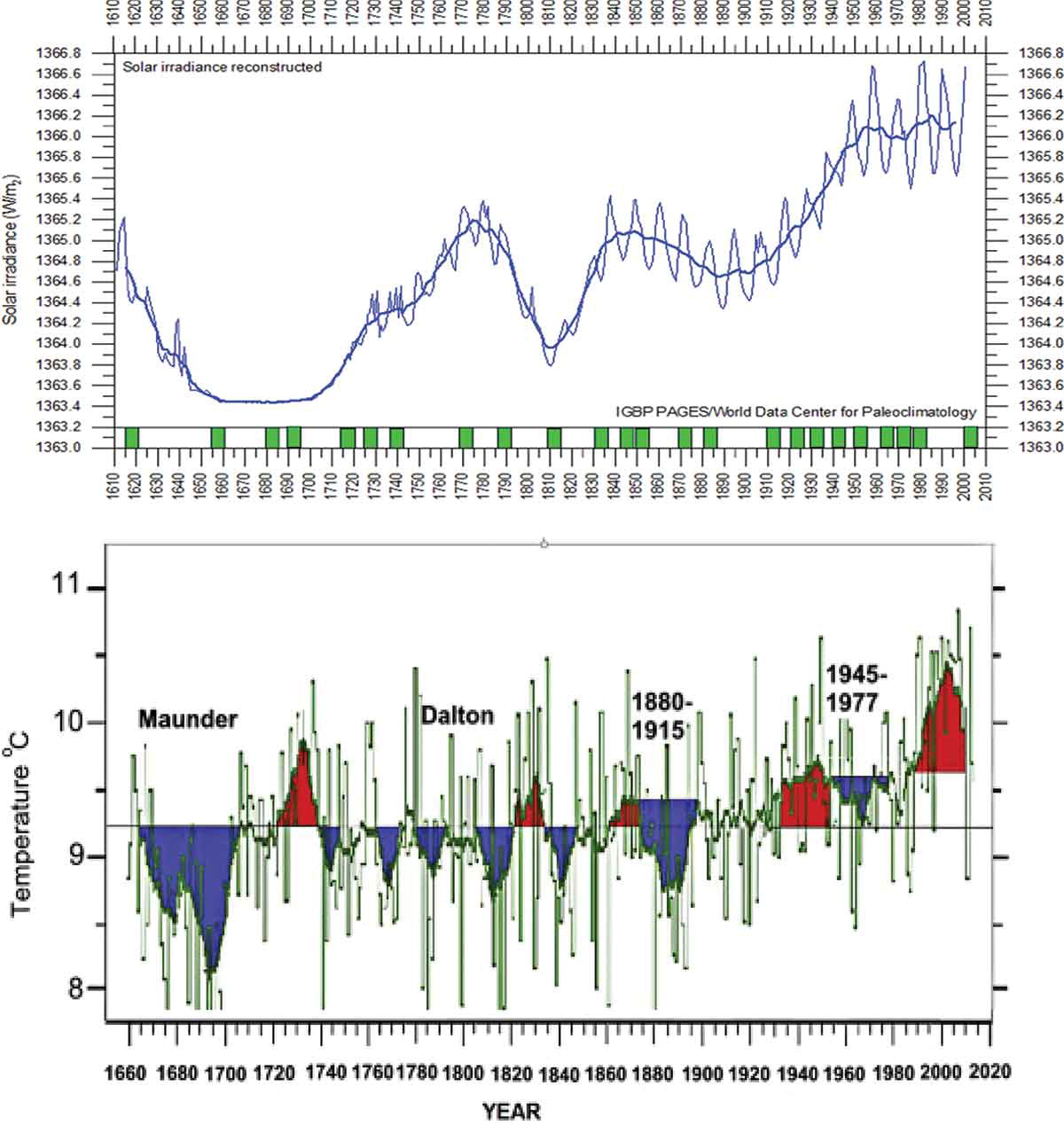 Abbildung 4. Oberer Plot: Rekonstruierte TSI von 1600 bis 2014 von Lean et al. [2], modifiziert von Easterbrook [3], aus Lean, Beer, Bradley [2]. Unterer Plot: Mitteleuropa-Temperaturen (CET), die seit 1658 kontinuierlich aufgezeichnet wurden. Blaue Bereiche sind wiederkehrende kühle Perioden; rote Bereiche sind warme Perioden. Alle Zeiten der solaren Minima fielen mit kühlen Perioden in Mittelengland zusammen. Übernommen aus Easterbrook [3], mit Erlaubnis des Elsevier-Verlags.