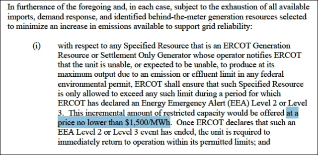 Darüber hinaus wurde angeordnet, dass eine „zusätzliche Menge zu der eingeschränkten Kapazität“ an ERCOT zu „einem Preis von nicht weniger als 1.500 $/MWh“ verkauft werden muss, eine Steigerung von über 6.000 Prozent gegenüber den Preisen vom Februar 2020 in Höhe von 18,20 $.