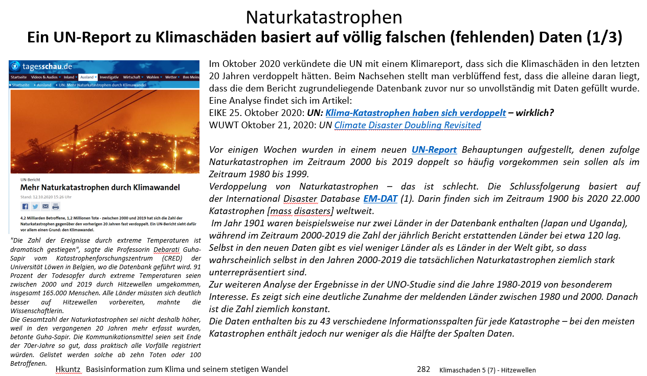 Im Artikel wird berichtet: „Naturkatastrophen sind oft unvorhersehbar … Es gab sie schon immer, aber in den letzten 20 Jahren sind es fast doppelt so viele geworden. Daran ist der Klimawandel schuld.“