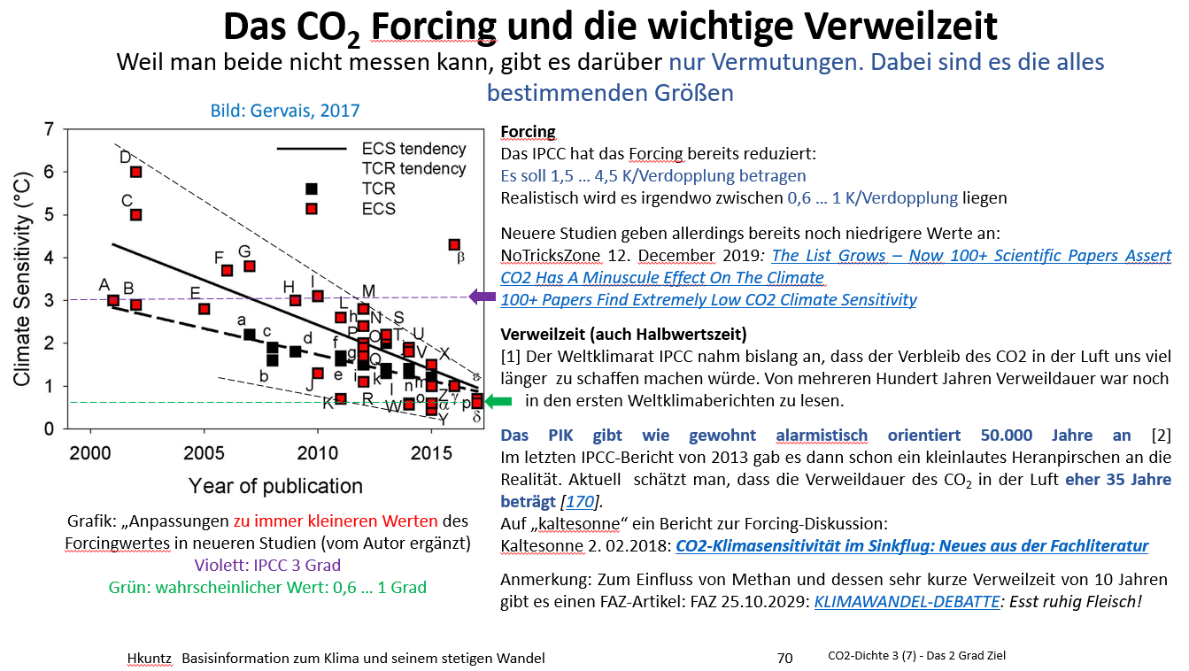 Auf den wirklichen Wert(ebereich) des postulierten „Treibhauseffektes“ (Forcing), der immer niedriger angesetzt wird und bereits beim aktuellen Stand von ca. 1,5 K/Verdopplung zu keinem Klimaalarm mehr Anlass gibt, geht ihr Autor nicht ein. Auch, dass der Treibhauseffekt immer noch nicht belegt werden konnte, sondern seit Arrhenius eine Hypothese geblieben ist.