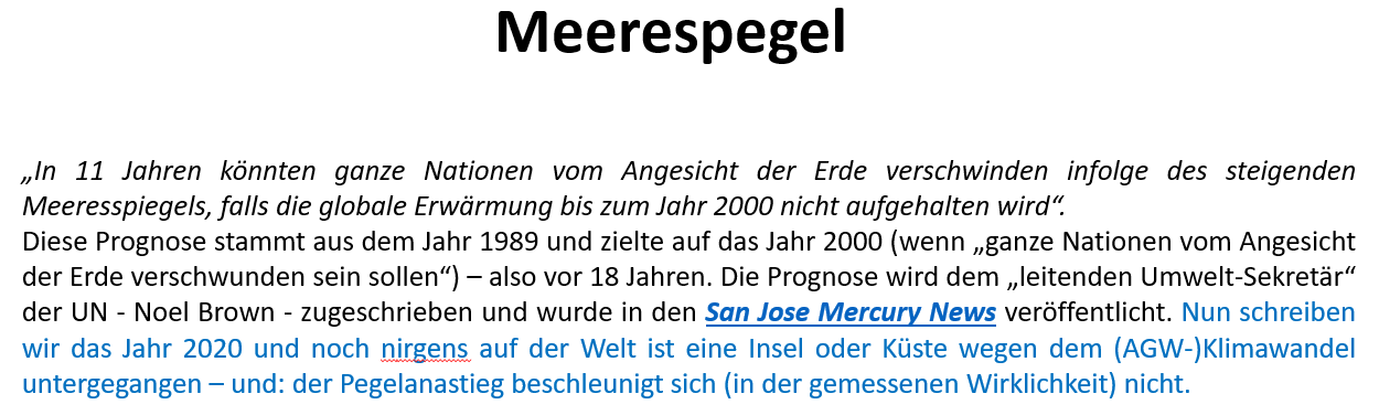 Das ist eine der mantrahaft wiederholten, leider jedoch nur noch dämlichen Aussagen. Sie widerspricht nämlich allen Proxydaten und den aktuell gemessenen Meerespegeln. Ich recherchiere seit vielen Jahren dazu, und immer komme ich zum gleichen Ergebnis: Nirgendwo steigt der Tidenpegel übernatürlich! Alle „gemeldeten“, schlimmen Pegelanstiege entstammen Simulationen.