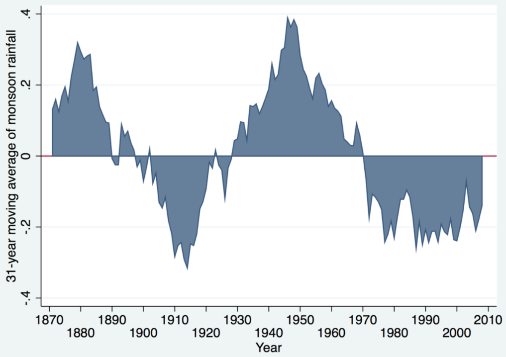 Bild 22 India 31-year moving average of monsoon rainfall. Quelle: Grafik aus: Adaptation to climate change: historical evidence from the Indian monsoon, Published online by Cambridge University Press: 27 June 2017