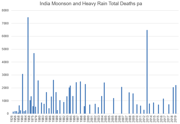 habe ich mit etwas Aufwand (privat macht man das, was sich bezahlte Redakteure heutzutage ersparen) die niederschlags-bedingten Mortalitätsdaten von Indien herausgefiltert, auf Jahreswerte summiert und grafisch dargestellt. Bedenkt man, wie die Bevölkerungszahl in dem Zeitraum explodiert ist und was für ein Siedlungsdruck in hochwassergefährdete Niederungen entstand, dann ist der Mortalitätsverlauf einfach nur als „glücklich“ zu bezeichnen.