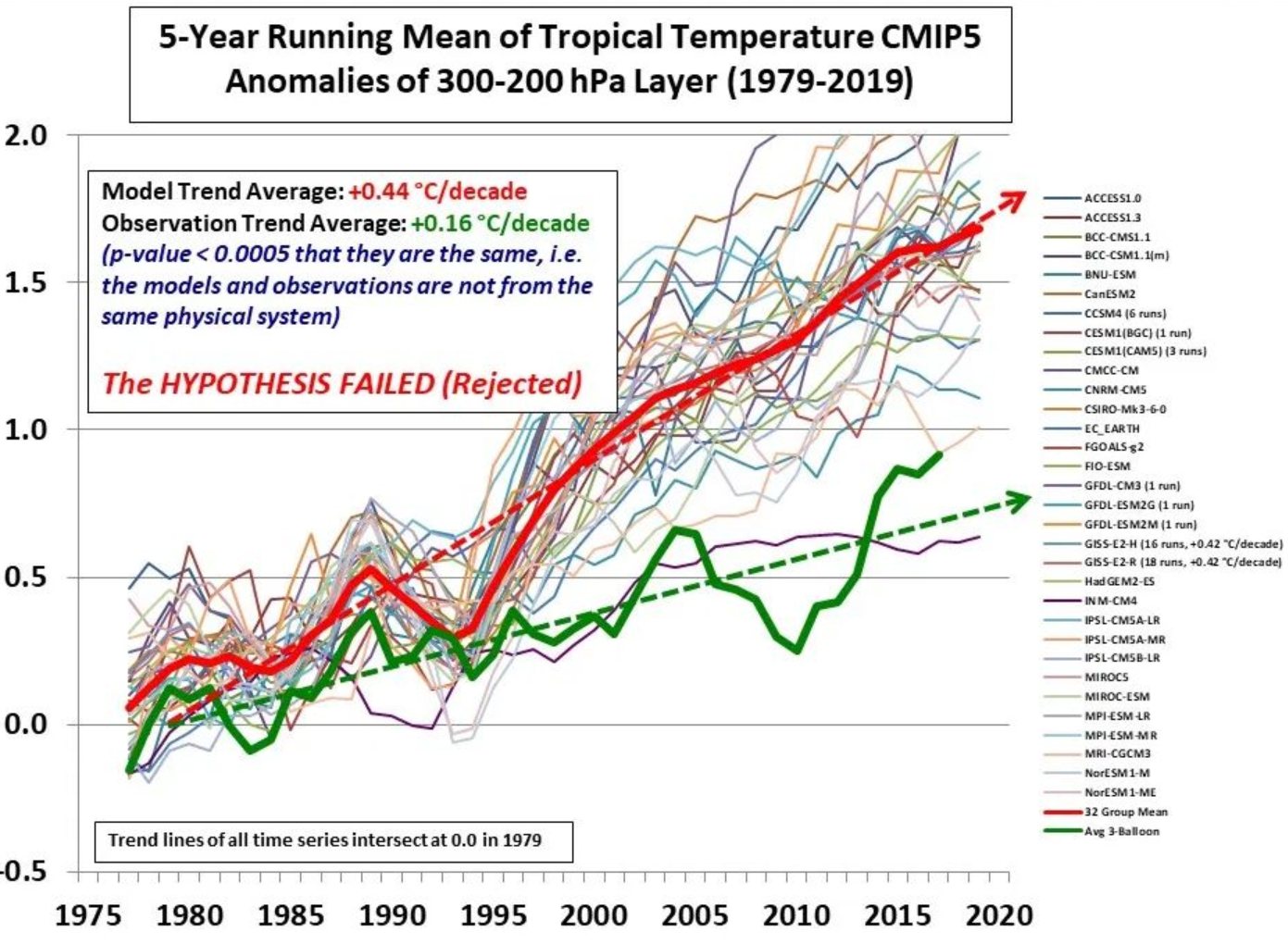 Abbildung: Ergebnisse der CMIP5-Klimamodelle im Vergleich mit Messungen von Wetterballonen (grün). Einzelheiten dazu, warum die Modelle statistisch so falsch sind, können in einer Studie von McKitrick und Christy (2018) nachgelesen werden.