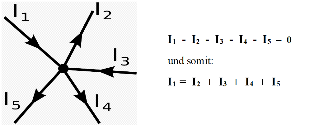 Weshalb ist das möglich? Ganz einfach, die Antwort gibt die Kirchhoff’sche Knotenpunktregel. Nachfolgend wird eine Grafik von Wikipedia verwendet. Zu beachten ist dabei, dass der Knotenpunkt keine zusätzliche Strom- bzw. Energiequelle enthält. Die Pfeilrichtungen sind unbedeutend, sie geben nur die Zählrichtung vor. Flussrichtungen entgegen der vorgegebenen Pfeilrichtungen sind gleichbedeutend mit negativen Vorzeichen. Auch kommt man im Oberflächenmodell mit nur vier „Pfeilen“ aus.