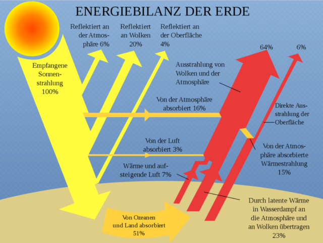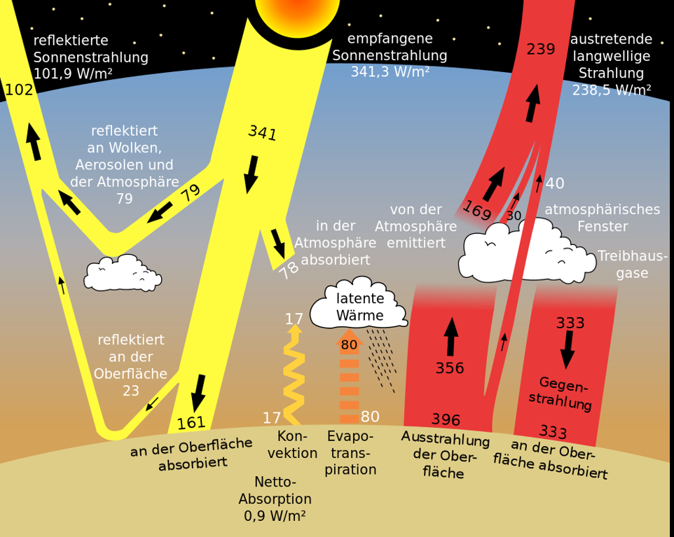 Dort wird der Gesamtantrieb, der weiter unten noch genauer beschrieben wird, aus der Energiebilanz an der Erdoberfläche berechnet. An der Erdoberfläche, wo wir leben, wird das wärmende Sonnenlicht absorbiert, deutlich weniger hingegen in der überwiegend dünnen und kalten Atmosphäre weiter oben. Von der Erdoberfläche wird auch wieder Energie abgeben, die über die Atmosphäre, die Wolken und letztlich durch Infrarot(IR)-Strahlung den Weg zurück ins Weltall findet. Dazu siehe auch die Strahlungsgrafik von Trenberth & Kiel weiter unten.