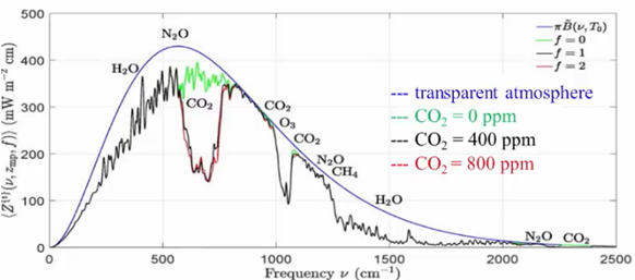 Bei CO2 errechnet man einen Strahlungsantrieb von 3,7 Watt//m2, der bei CO2-Verdoppelung wirksam wird und die Temperaturen um 1,1 Grad C (bei einigen Autoren etwas mehr) erhöht. Diesen Temperaturanstieg nennt man dann CO2-Klimasensitivität. Tatsächlich handelt es sich um einen verringerten IR-Strahlungstransport, wie folgende Grafik der in den Weltraum emittierten Infrarotstrahlung in Abhängigkeit von der Frequenz zeigt (nach Prof. Happer et al.):