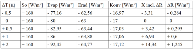 Sofern durch anthropogene Klimagase, variierende Sonneneinstrahlung (So) und andere natürliche Einflüsse Änderungen in der Oberflächenbilanz auftreten, sind sie im Gesamtantrieb X enthalten – siehe nachfolgende Ergebnistabelle, die aus der eingangs zitierten Arbeit übernommen wurde: