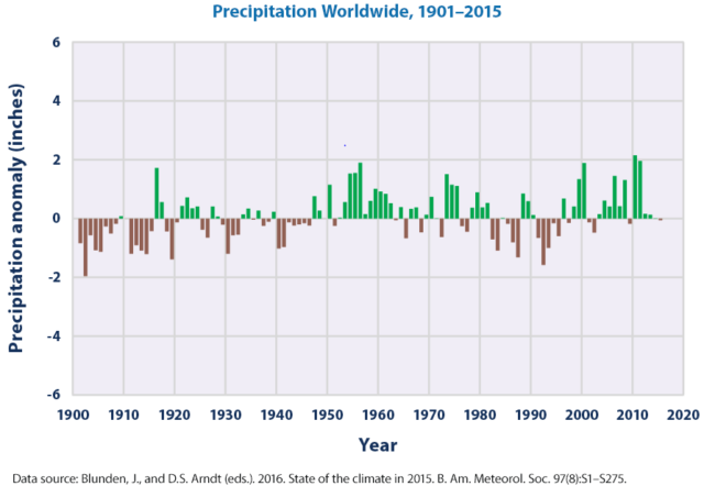 Vermutlich realitätsnäher sind die Anomaliewerte für die globalen Niederschläge, die von der US-Umweltbehörde EPA gemäß nachfolgender Grafik veröffentlicht wurden. Die globalen Niederschläge stiegen den EPA-Angaben zufolge mit 0,08 inches/Dekade, während sie über Festland-USA (48 Staaten) um 0,17 inches/Dekade zunahmen. Nimmt man in Anlehnung an Jäger den globalen Mittelwert mit 40 inches an, dann sind laut EPA die globalen Niederschläge, bezogen auf 40 inches, sei 1900 nur um 2,4% angestiegen.