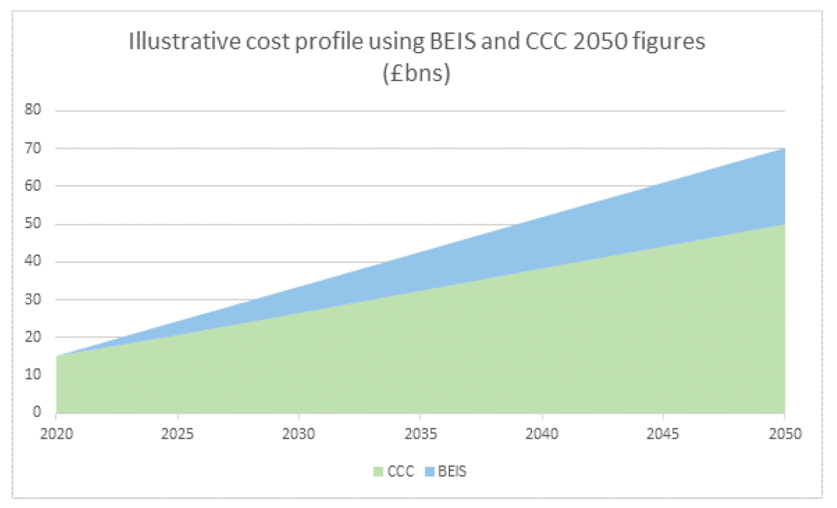 Wir wissen nun, dass die Modellierung des BEIS schätzte, dass sich die Kosten für Net Zero bis 2050 auf 1.275 Mrd. £ belaufen würden. Die jährlichen Kosten wurden modelliert, um von derzeit 15 Mrd. £ pro Jahr auf etwa 70 Mrd. £ im Jahr 2050 zu steigen. Dies wird durch eine Grafik des Finanzministeriums veranschaulicht, die eine zunehmende Divergenz mit den CCC-Berechnungen zeigt: