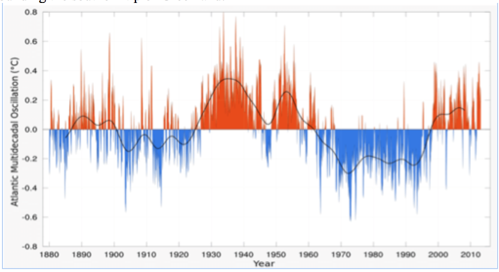 Die Atlantische Multidekadische Oszillation (AMO) ist der prominenteste Modus der multidekadischen atlantischen Variabilität; die physikalischen Ursprünge der AMO bleiben jedoch ein Thema anhaltender Debatten. Die beobachteten SST-Änderungen der AMO werden seit langem auf langsame Variationen des nordwärts gerichteten Wärmetransports im oberen Ozean durch die AMOC zurückgeführt. Ozeanische Prozesse bieten einen plausiblen Mechanismus für große multidekadische Klimaschwankungen; solche Schlussfolgerungen basieren aufgrund der kurzen Aufzeichnung der AMOC-Zirkulation, die erst 2004 beginnt, weitgehend auf Klimamodell-Simulationen.
