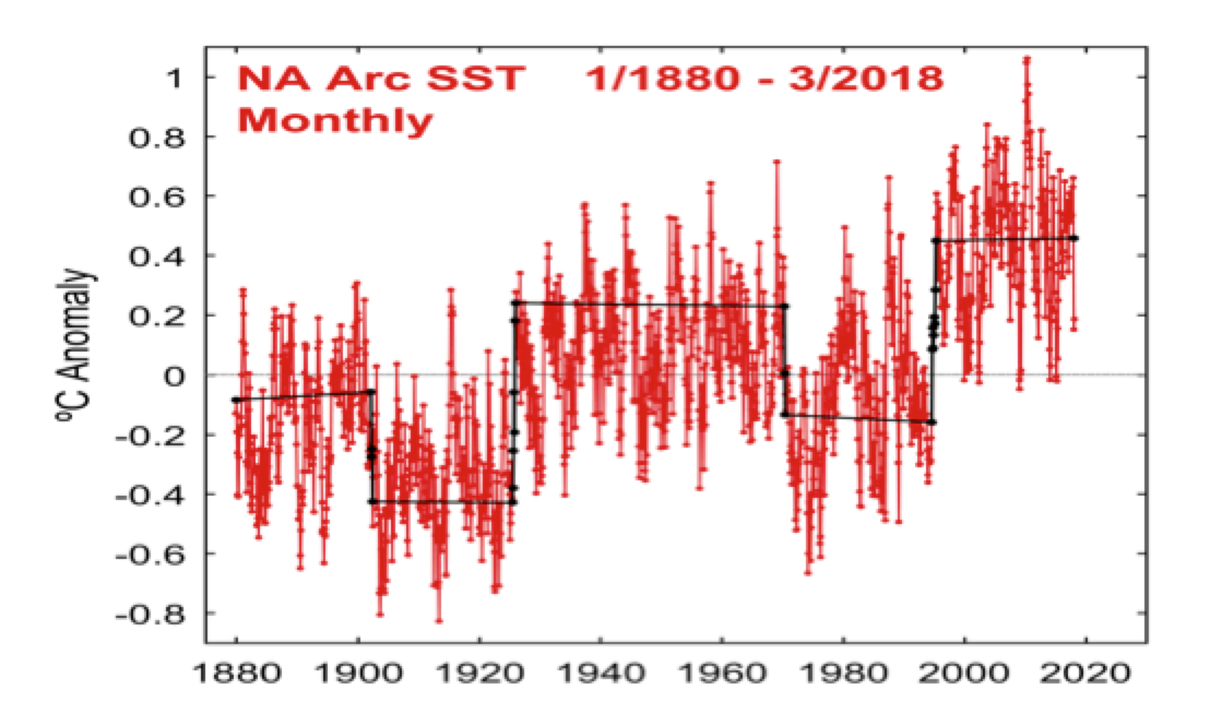 Johnstone (2017) beschreibt ein „coupled shift model“ des niederfrequenten nordatlantischen Klimawandels, das auf abrupten Übergängen zwischen quasi-stabilen Wassertemperaturen und gekoppelten atmosphärischen Zirkulationen basiert. Diese Hypothese beschreibt wiederkehrende stufenförmige Änderungen der nordatlantischen SST, wobei SST-Störungen mit großer Amplitude gelegentlich als anomale multidekadische Klimazustände durch positive Atmosphäre-Ozean-Rückkopplungen aufrechterhalten werden. Es wird der statistische Nachweis erbracht, dass niederfrequente SST-Änderungen keine graduellen Prozesse waren, wie sie üblicherweise beschrieben werden, sondern durch eine Reihe von kurzen, diskreten Ereignissen, gekennzeichnet durch abrupte ~1-Jahres-stufenartige Verschiebungen, die längere multidekadische Perioden mit relativ geringen Veränderungen trennen.