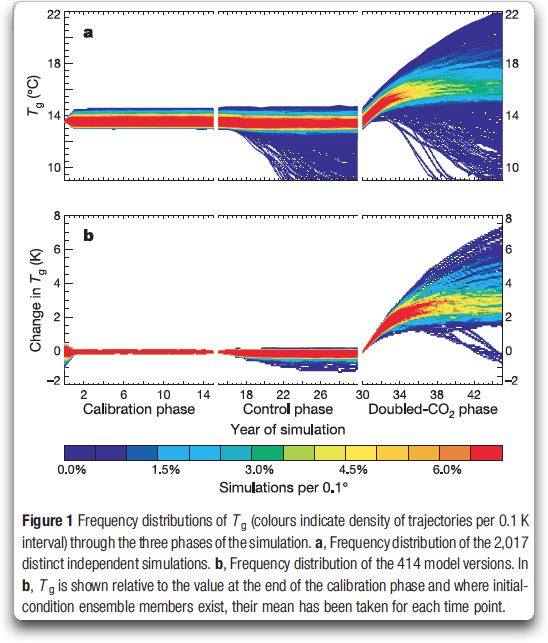 ● Viele Läufe von Klimamodellen enden auf dem Fußboden des Schneideraums, weil sie nicht mit den Überzeugungen, Auffassungen, falschen Ideen und Missverständnissen des besagten Programmierers übereinstimmen. Sie zeigen uns nur die Ergebnisse der Modellläufe, mit denen sie einverstanden sind, nicht aber die Ergebnisse der Läufe, bei denen das Modell aus den Fugen geraten ist. Hier sind zweitausend Läufe von 414 Versionen eines Modells, das zuerst eine Kontroll- und dann eine Doppel-CO2-Simulation durchführt. Man erkennt, dass viele der Ergebnisse weit aus dem Rahmen fallen: