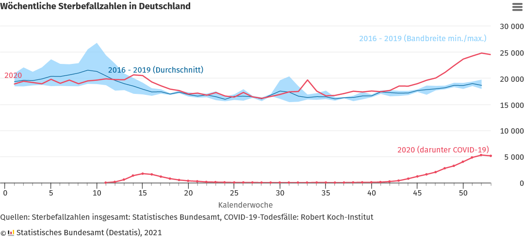 Es gab in 2020 durch Covid-19 keine Übersterblichkeit, wenn man die gestiegene Zahl der Menschen über 80 Jahre berücksichtigt und mit der zu erwartenden Zahl an Todesfällen vergleicht.