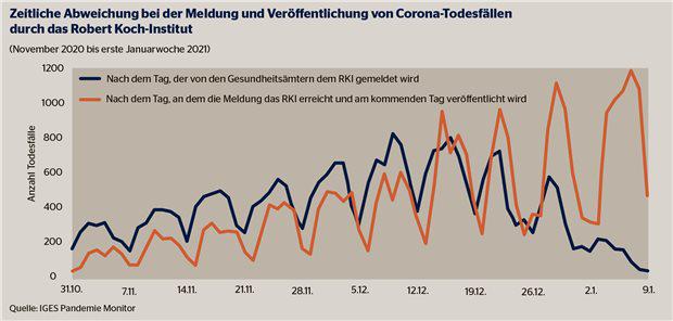 Der Höchststand der gemeldeten Covid-19 Sterbezahlen war laut RKI im 7-Tage-Mittel am 10.1.2021. Das mittlere Alter der übermittelten Zahlen beträgt 4 Wochen laut IGES (Institut für Gesundheits- und Sozialforschung). Der effektive Höchststand war deshalb am 13.12.2020, das bedeutet, dass seit fast drei Monaten die Sterbezahlen zurückgehen, sh. Grafik (blaue Kurve).