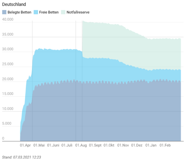 Der zweite oft vorgebrachte Grund für den Lockdown ist, dass die „Überlastung des Gesundheitssystems vermieden werden muss“. Die Belegung der Intensivstationen (die untere Kurve der Grafik) ist und war im Winter nicht höher als im Sommer, als praktisch keine Covid-19-Patienten auf den Intensivstationen lagen. Am 7.3.2021 sind in Deutschland 2778 Intensivbetten mit Covid-19-Patienten belegt, weniger als halb so viele wie Anfang Januar. Das sind 11,6 % der gesamten Bettenzahl von 23934 (ohne Notfallreserve). 4282 Betten sind frei. Die Anzahl an freien Betten ging nur deshalb zurück, weil das Personal knapp wurde. Und wenn Intensivstationsbetten in bestimmten Regionen knapp werden, dann ist das nichts Neues, wie Berichte aus 2019 und 2017 zeigen: https://www.aerzteblatt.de/archiv/205989/Intensivmedizin-Versorgung-der-Bevoelkerung-in-Gefahr „Nun klagen die Notaufnahmen mehrerer Kliniken in Nürnberg und München über Überlastung.“ (https://www.aerzteblatt.de/nachrichten/72938/Grippewelle-sorgt-fuer-ueberlastete-Kliniken). Auf die Hinweise verschiedener Klinikleiter, dass mehr als die Hälfte der Intensivstationspatienten Migrationshintergrund haben, kann ich derzeit nur verweisen und hinzufügen, dass die Datenlage dünn ist, weil die Herkunft der Patienten nicht offiziell erfasst wird: https://focus.de/13039874