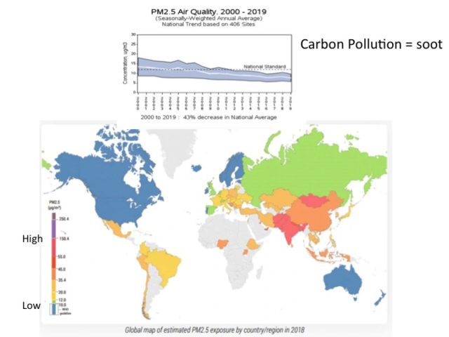 Bei der Luftverschmutzung handelt es sich nicht um C02, sondern um kleine Partikel (PM2,5). Sehen Sie, wie in den USA die Werte um 43% gesunken sind, weit unter den Zielen, die wir uns gesetzt haben. Wir und Skandinavien und Australien haben die niedrigsten Werte der Welt – siehe China, die Mongolei und Indien: