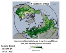 Es hat zu einer globalen Ergrünung geführt. Die Fläche der Sahara ist seit 1990 um etwa 8% geschrumpft [Leider lässt sich diese Grafik nicht vergrößern. A. d. Übers]: