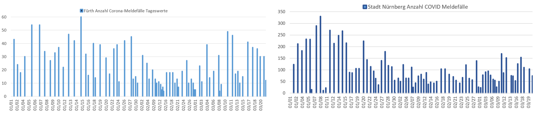 Bild 4 Städte Fürth und Nürnberg, Tageswerte Corona-Meldefälle seit dem 01.01.2021. Grafik vom Autor erstellt. Datenquelle: RKI-Coronadaten