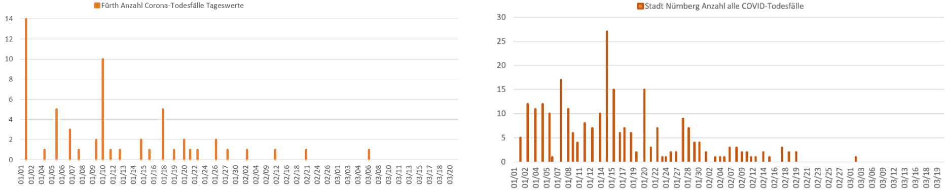 Die aktuellen Daten des RKI für Fürth und Nürnberg (sowie alle weiter gelisteten), von mir grafisch aufbereitet, zeigen weder: