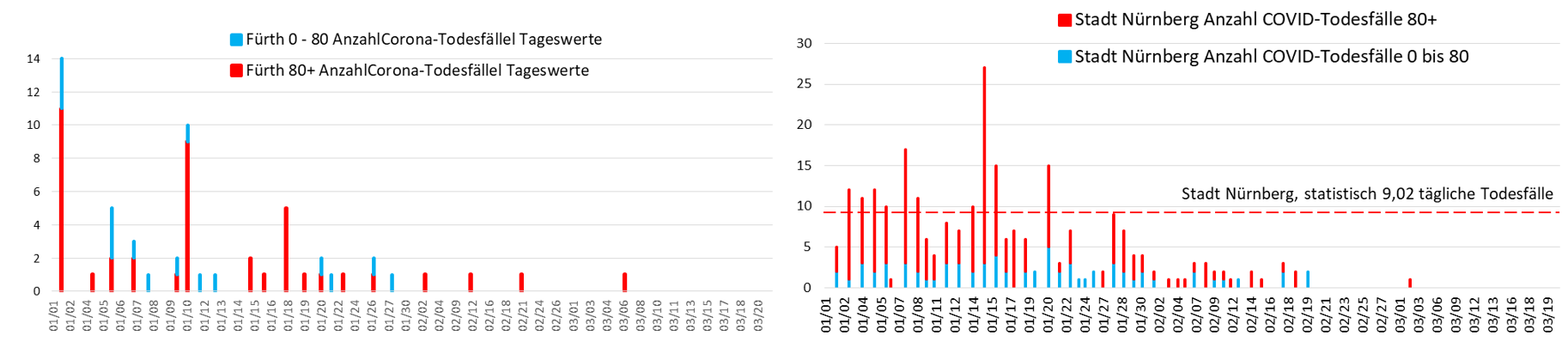 Bild 6 Städte Fürth und Nürnberg, Tageswerte Corona-Todesfälle unter und über dem Alter 80+ seit dem 01.01.2021. Grafik vom Autor erstellt. Datenquelle: RKI-Coronadaten