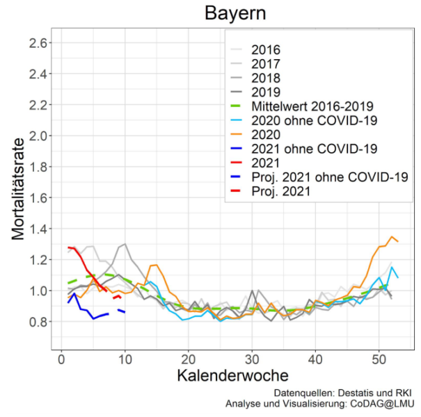Danach hat es weder im Jahr 2020 eine Übersterblichkeit gegeben, noch besteht derzeit eine. Auch eine Überlastung der Intensivstationen ist nicht erkennbar.