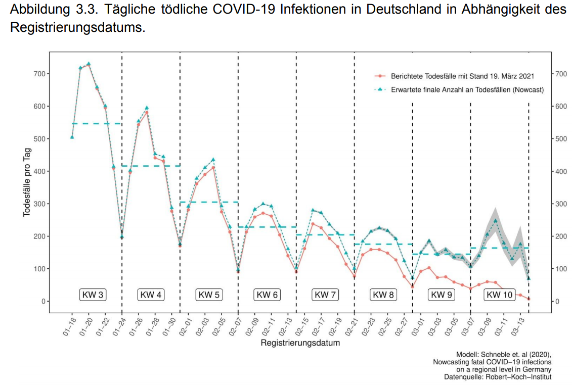 Im aktuellen Bericht „CODAG Bericht Nr. 11 19.03.2021“ steht: … In allen drei Graphiken ist ein Rückgang der tödlichen COVID-19 Fälle bis einschließlich Kalenderwoche 9 zu erkennen. Für ganz Deutschland sind nach unseren Berechnungen weniger als 200 tödliche Todesfälle im Tagesschnitt zu erwarten. Dies ist ca. 75% weniger als noch um den Jahreswechsel. Für Kalenderwoche 10 setzt sich der abfallende Trend der tödlichen COVID-19 Fälle sowohl bei den unter 80-Jährigen als auch bei den über 80-Jährigen nicht fort. Allerdings ist zu beachten, dass die Schätzung mit statistischer Unsicherheit belegt ist, was durch den grauen Hintergrund in Form eines 95% Konfidenzintervall visualisiert ist …