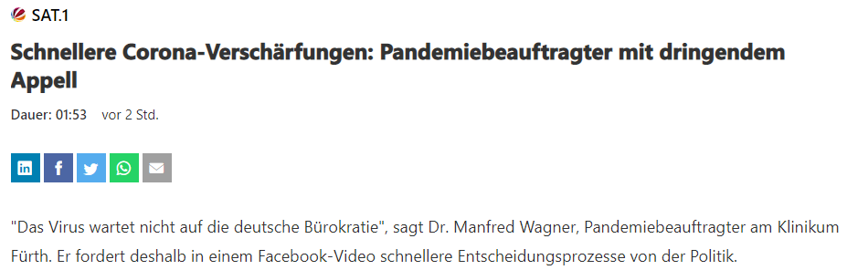 In der lokalen Zeitung führte es Herr Dr. M. Wagner aus und erklärte dazu in einem Artikel: „Wieder harsche Politik-Schelte aus dem Klinikum“, dass er von der Ministerpräsidentenkonferenz bezüglich der Coronaeinschränkungen für die Bevölkerung ein „agileres“ – also härteres Vorgehen – fordert.