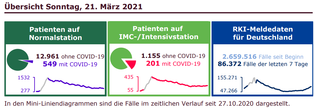 Eine Übersicht lieferte Achgut: [1] Achgut 22.03.2021: Lockdown für die Panikmacher! Oder: Lest doch bitte die RKI-Zahlen