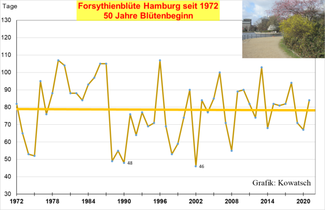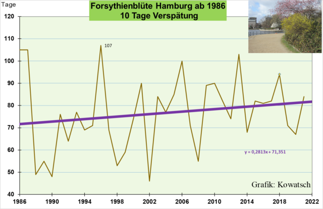 „Die Temperaturen des Monates Februar und März bestimmen im Wesentlichen den Blütenbeginn des Forsythienstrauches in der Innenstadt von Hamburg.“ Ja schon richtig, allerdings ist Ihr Schluß daraus wie zu erwarten falsch:die Forsythien erblühen später weil es wärmer wird!Und würden Sie nicht diesem Skeptikeraberglauben anhängen und der Klimawissenschaft die nötige Achtung und den befohlenen Respekt entgegenbringen, dann würden Sie nicht diese Tatsachen verdreht darstellen wollen.Also:Wenn unsere über alles geliebte Führerin sagt es wird gefährlich wärmer, dann ist das so!Und der Forsythienstrauch ist der Beweis hierfür und steht für den Hilferuf der Natur!