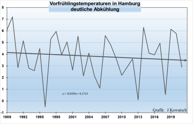 Danke für ihre stets wertvollen Ergänzungen, Sie versuchen in all unseren Artikeln auch andere Aspekte der Betrachtung hinzu zu fügen. Leider haben wir vom Standort der Forsythie keinerlei Bodentemperaturerhebungen, nicht einmal kontinuierliche Wassertemperaturmessungen der angrenzenden Alster, beides spielt für den rückläufigen Blühtermin seit 37 Jahren bestimmt mit. Uns liegt leider nur die Lufttemperatur und Bodentemperaturreihe vom 7 km entfernten Flughafen vor. Wir stimmen mit Ihnen überein, dass viele Faktoren den Blühtermin einer Pflanze bestimmen. Falsch ist halt nur die Behauptung: CO2 erwärmt das Klima und deshalb kommt der Frühling immer früher.