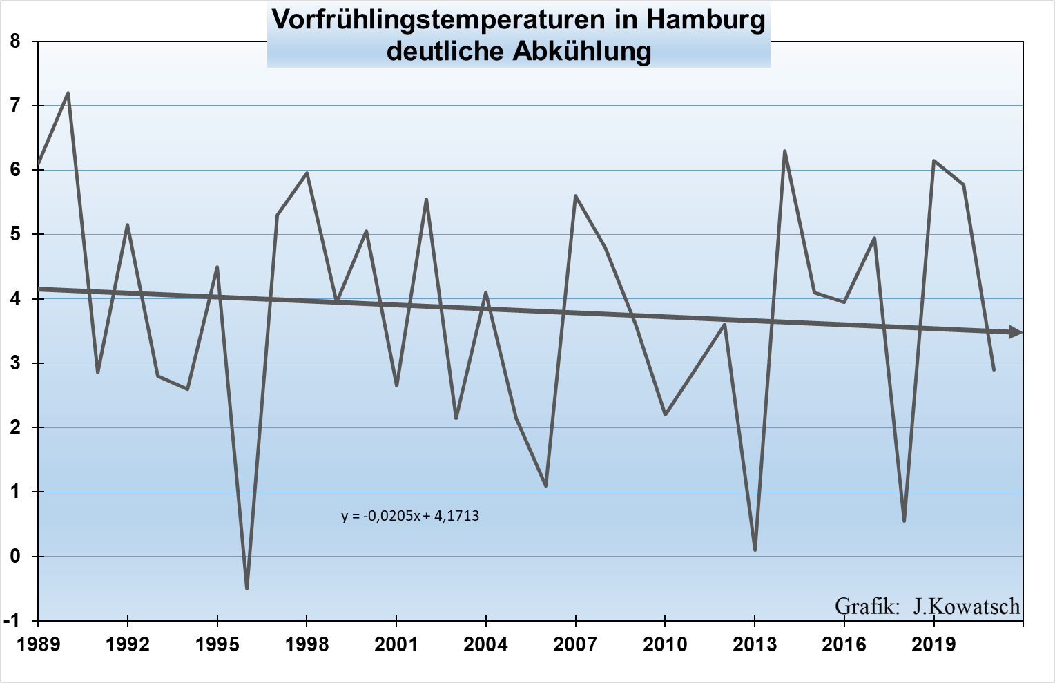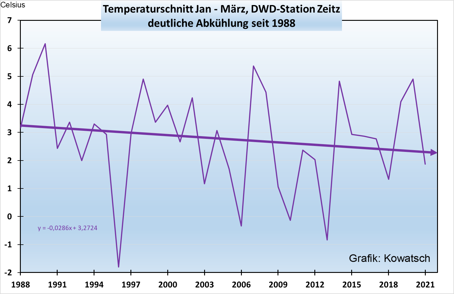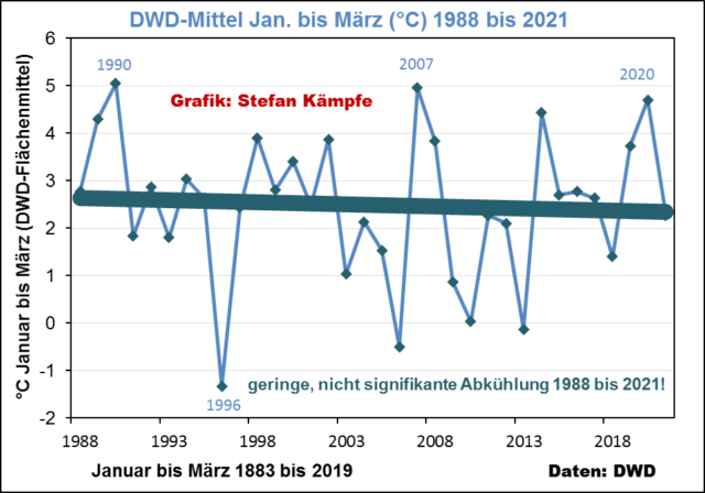 Abbildung 6: Seit 1988, das sind nunmehr schon stattliche 34 Jahre, hat es sich im Zeitraum von Januar bis März in Deutschland nicht mehr erwärmt – folglich war auch keine Verfrühung des Erstfrühlingsbeginns in diesem Zeitraum zu beobachten.