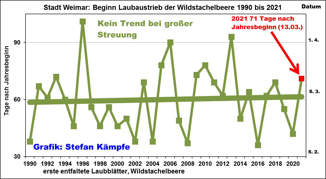 Ähnlich wie die Forsythie verhält es sich mit dem etwas früheren Laubaustrieb der Wilden Stachelbeere, welcher ebenfalls seit der Deutschen Einheit in der Stadt Weimar stagniert. Wegen eines tendenziell etwas wärmeren Aprils hat sich jedoch der Einzug des Vollfrühlings (Beginn der Apfelblüte) leicht verfrüht. Aus der Differenz beider Eintrittstermine ergibt sich die Dauer des Erstfrühlings. Bei der Analyse der Forsythie- Daten käme man zu ähnlichen Ergebnissen mit insgesamt geringeren Tageszahlen der Erstfrühlingsdauer: