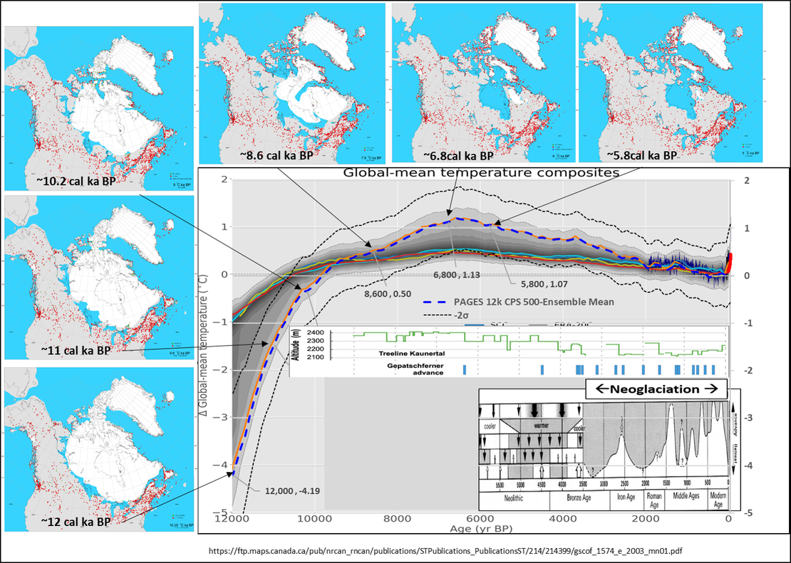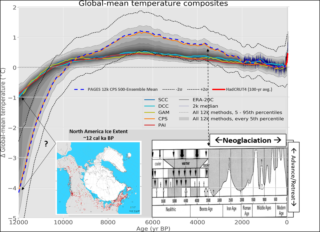 Ich habe einen Plot von CPS als Overlay von Abbildung 3 aus dem PAGES 12K-Paper erstellt und den 2K-Inset mit den historischen Klimaperioden und der Neoglazialisierung aus Grosjean et al., 2007 und einer Nordamerika-Eisausdehnungskarte aus Dyke et al., 2003 ersetzt. Ich habe auch ein 2σ-Konfidenzband aus den 500 Ensemblemitgliedern eingefügt. Meine Version des CPS-Mittelwerts ist die gestrichelte orangefarbene Kurve…