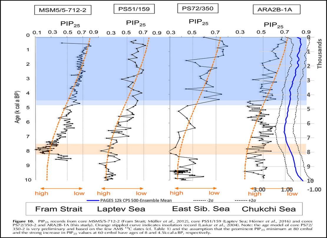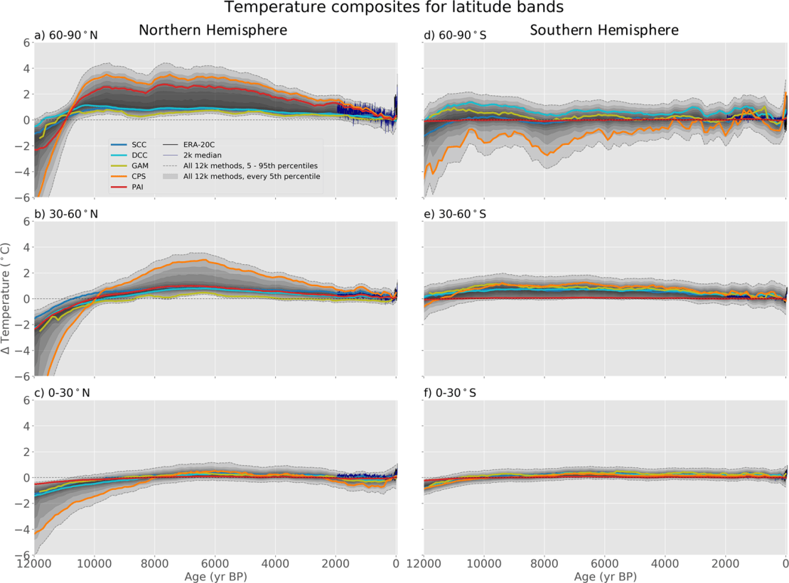 Die anderen vier Verfahren zeigen sehr geringe Temperaturänderungen von vor 9.500 Jahren bis 1850 n. Chr… Ein Zeitraum, von dem wir wissen, dass es in den ersten 5.000 Jahren einen massiven Eisrückgang und in den meisten der folgenden 4.500 Jahre einen Eisvorstoß (Neoglazial) gab. CPS ist das einzige der vier Verfahren, das mit der holozänen Entwicklung der Eisschilde und Gletscher in der nördlichen Hemisphäre übereinstimmt. Das ist auch konsistent mit der holozänen Entwicklung des arktischen Meereises.