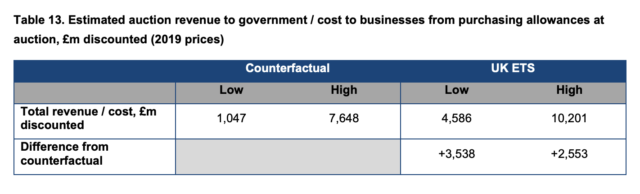 Zum Vergleich enthält die von der britischen Regierung selbst durchgeführte Prognose zur Folgenabschätzung für die CO2-Preisgestaltung Vergleiche darüber, welche Einnahmen im Rahmen des EU-EHS erzielt worden wären und im Rahmen des britischen EHS erzielt werden.