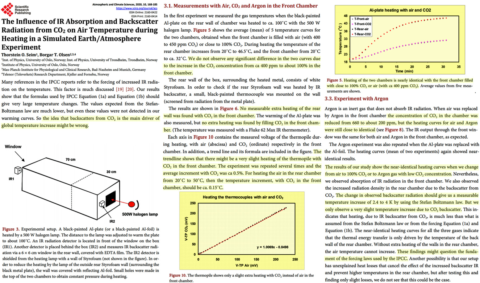 # Beobachtungen und Experimente stützen einen großen Antriebs- Effekt von CO2 nicht! Das im obigen Artikel beschriebene Labor-Experiment der beiden Physiker aus Oslo fand in einer Kammer statt. Ein CO2- Versuch unter realem Sonnenlicht im Freien in einem nach oben offenen, transparenten Kasten aus Polystyrolglas liefert bei mir ein sehr, sehr ähnliches Ergebnis: Der fiktive, rechnerische Strahlungsantrieb von CO2 der Treibhaushypothese wird durch diesen praktischen Versuch ebenfalls widerlegt. Alle verwendeten Geräte, der Versuchsaufbau, sein Ablauf, die fotografische Dokumentation der Messungen (Anstieg der Konzentration von CO2, Temperaturänderung) sind im Anhang 4, S.178 – 182, der 2. Auflage, 2021, Kritische Analyse zur globalen Klimatheorie ausführlich veröffentlicht, siehe auch Buchvorstellung durch Herrn Michael Limburg auf EIKE vom 1.4.2021, Titel: „Immer mehr klimarealistische Bücher kommen auf den Markt.“