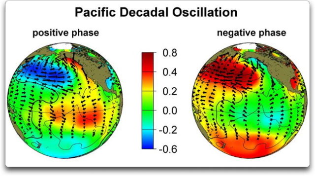 Und hier eine Graphik des PDO-Index‚, einer Maßzahl für die Phase der PDO: