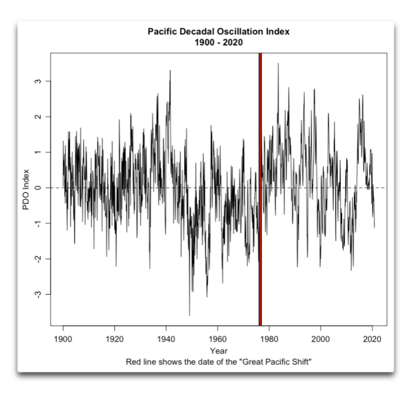 Abbildung 2. PDO-Index, und das Datum der „Großen Pazifischen Klimaverschiebung“ von 1976-1977.
