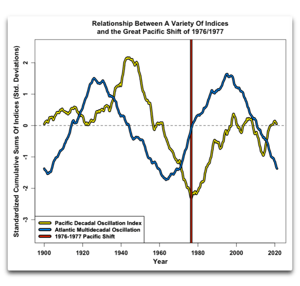 Wie man sieht, zeigt die kumulative Summe des PDO-Index‘ eindeutig das Datum der Verschiebung des pazifischen Klimas in die warme Phase der PDO.