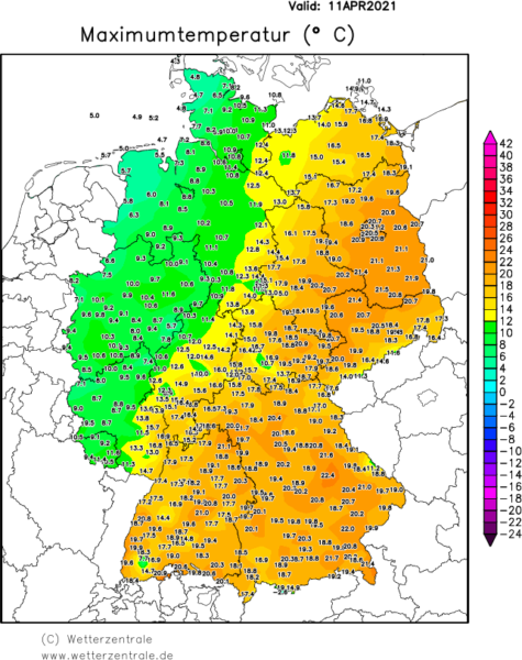 Tim Weingärtner, ein bekannter Wetterprophet von daswetter.com prophezeite Mitte Januar einen sonnigen, trockenen und sehr warmen Frühling, wobei bereits der Februar den Frühlingsbeginn einläuten sollte, siehe hier: https://www.daswetter.com/nachrichten/vorhersage/wetter-im-fruehling-2021-deutschland-prognose-wettertrend-wettervorhersage.html. Der Frühling beginnt, wenn im Hamburg an der Alster die Forsythie blüht, sagt der Deutsche Wetterdienst, und das war diesmal Ende März. Tim Weingärtner hat anscheinend die positive Wirkung der CO2-Steuer nicht beachtet. Seit der grausamen Erhöhung zu Jahresbeginn zeigt sich prompt die von der Regierung erwünschte Korrektur: Es wurde in den ersten vier Monaten deutlich kälter. Mein Gasverbrauch beträgt bis heute bereits 60% des Jahresverbrauchs von 2020. Ist diese bisherige Temperaturdelle im Jahre 2021 nun ein Erfolg von Laschet oder von Söder? Wer kann besser Wetter und Klima?