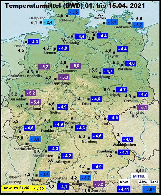 Abbildung 2: Dicke Minuszeichen. Temperaturmittelwerte repräsentativer, deutscher DWD-Stationen für die erste Aprilhälfte 2021. Die farbig hinterlegten Zahlen sind die bis dahin aufgelaufenen Abweichungen zum Klimamittel 1991 bis 2020 in Kelvin (1 Kelvin = 1°C). Das von HUSSING errechnete Gesamtmittel von 4,46°C kommt dem realen DWD-Flächenmittel sehr nahe. Auch wenn das Temperaturdefizit sicherlich in der zweiten Aprilhälfte abnehmen dürfte – dieser April wird merklich zu kalt enden. Bildquelle bernd-hussing.de, ergänzt