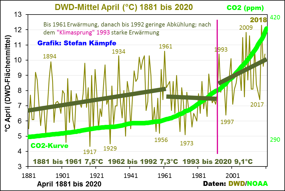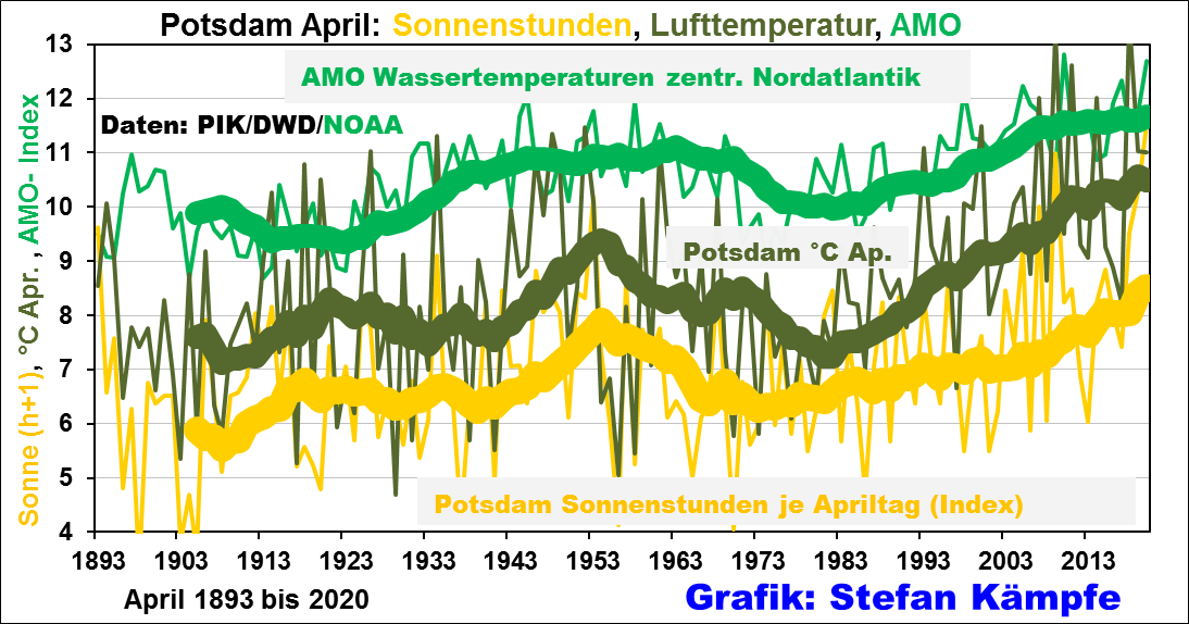 In verschiedensten Einzelbeiträgen hatten KOWATSCH/KÄMPFE das Temperaturverhalten der Monate in Deutschland untersucht. Bei den meisten folgte einer mehr oder weniger langen Erwärmungsphase zwischen dem Aufzeichnungsbeginn (1881) und etwa der Mitte des 20. Jahrhunderts eine Abkühlung; diese wurde durch einen Klimasprung, der, je nach Monat, zwischen Ende 1987 und spätestens 1995 begann, jäh beendet. Während im ersten Jahresviertel und im Dezember die in dieser Zeit markant steigenden NAO-Werte die Ursache waren, kommt für die übrigen Monate die einsetzende AMO-Warmphase in Betracht; im Sommerhalbjahr zusätzlich die deutlich zunehmende Sonnenscheindauer. Das gilt, wie wir gleich noch in einem gesonderten Abschnitt sehen werden, besonders für den April; und die steigenden CO2-Konzentrationen können die um 1970 sehr markante Abkühlungsphase auch beim April nicht erklären: