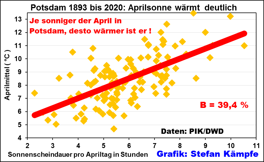 Abbildung 5: Mehr als ein Drittel der Gesamtvariabilität der April-Temperaturen Potsdams lässt sich mit der Sonnenscheindauer erklären; in Gesamtdeutschland herrschen ähnliche Verhältnisse.