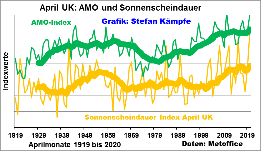 Abbildung 6: Auch im United Kingdom (Vereinigtes Königreich – Großbritannien) ist der April in den AMO-Warmphasen tendenziell sonniger. Zur besseren Visualisierung in einer Grafik mussten Sonnenscheindauer (pro Aprilmonat) und AMO in Indexwerte umgerechnet werden; das zeitliche Verhalten ändert sich dadurch nicht.