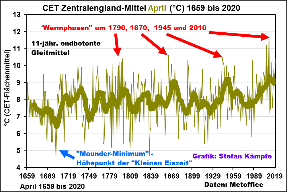 Abbildung 7: In der aktuellen Warmphase um (2010) gibt es mit 2007 und 2011 nur zwei herausragend warme Aprilmonate, ansonsten unterscheidet sich diese nicht von früheren Warmphasen. Die Langfrist-Erwärmung beträgt seit 1659, also über mehr als 360 Jahre, nur 1 Kelvin – das ist alles andere als beunruhigend. Das mögliche Ende der aktuellen Warmphase deutet sich an; und der auch in England recht kühle 2021er April ist noch gar nicht in der Grafik enthalten.