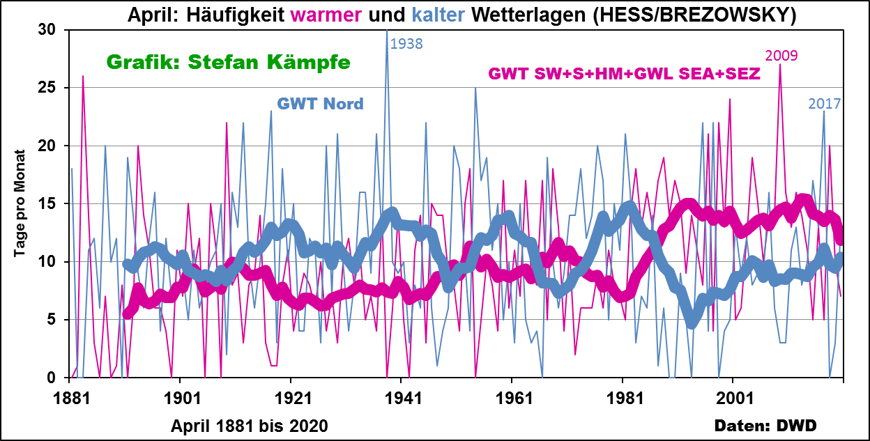 Abbildung 8: Seit Aufzeichnungsbeginn (1881) überwogen im April meist Nordwetterlagen (blau), im sehr kalten April 1938 gar an allen 30 Apriltagen. Die Dominanz warmer Südlagen seit dem späten 20. Jahrhundert gipfelte im sehr warmen April 2009 mit 27 Tagen und scheint aktuell zu enden – beide Kurven nähern sich wieder an, und der an Nordwetter reiche April 2021 ist noch gar nicht in der Grafik enthalten.