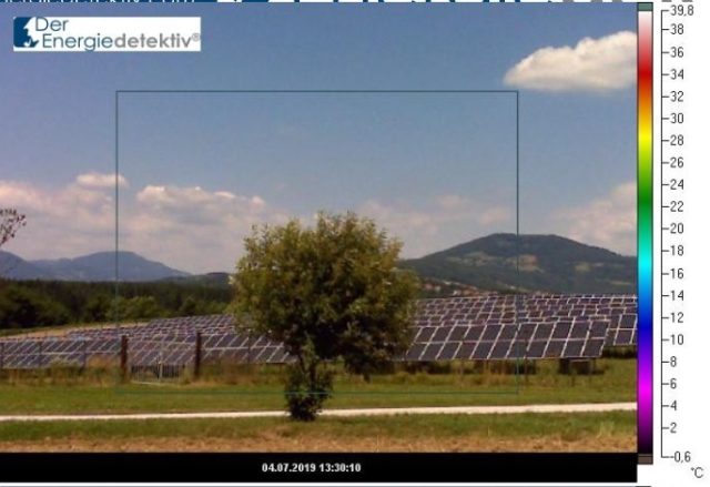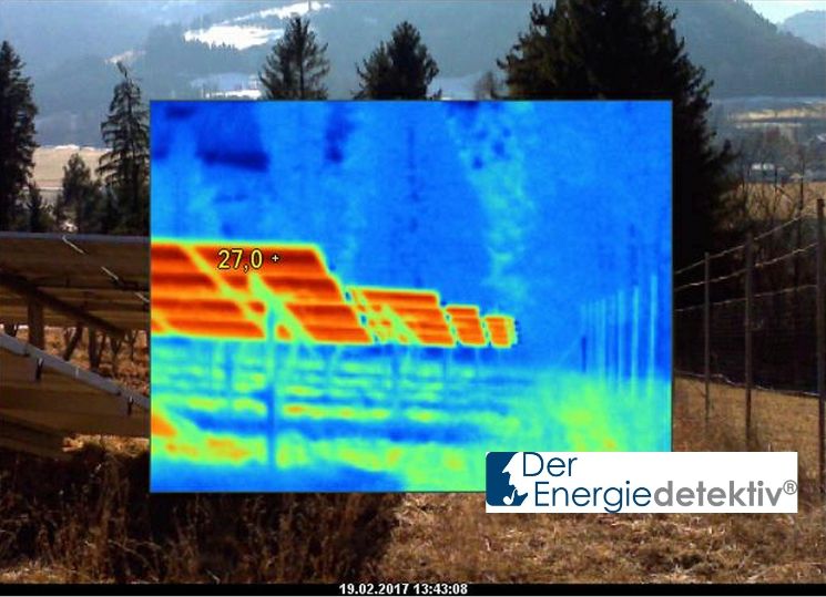 Photovoltaikanlage in ca. 870 m Seehöhe, Mitte Februar, Schnee am Boden, starker Wind und Lufttemperatur um den Gefrierpunkt. Die Sonne steht tief im Westen, die Solarfläche erreicht dennoch Temperaturen, die um mehr als 20 Grad über der Lufttemperatur liegen. Diese Wärme wird an die Umgebungsluft abgegeben und trägt zum Temperaturanstieg der Atmosphäre und verfrühter Schneeschmelze bei
