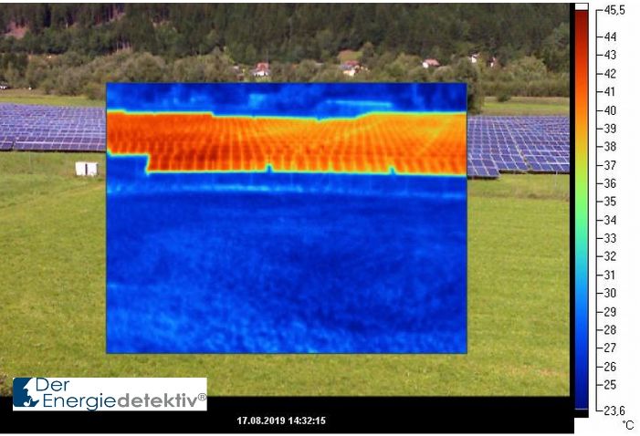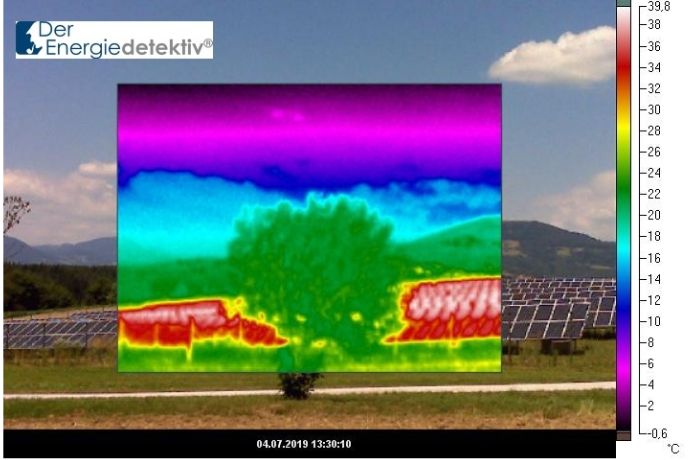 Nach Errichtung einer Solaranlage über einer solchen Grünfläche wird das eintreffende Sonnenlicht an der Solarfläche absorbiert. Zwischen etwa 10% und 30% des absorbierten Sonnenlichts werden in elektrischen Strom (PVA) oder Nutzwärme (thermische Solaranlage) umgewandelt. Die restlichen 70 bis 90% der absorbierten Sonnenenergie werden in Wärme umgewandelt und an die umgebende Luft abgegeben. Damit sind diese technischen Flächen primär „solare Heizkörper“, die den Temperaturanstieg in der Atmosphäre fördern. Die folgenden Fotos und Wärmebilder dokumentieren dies.
